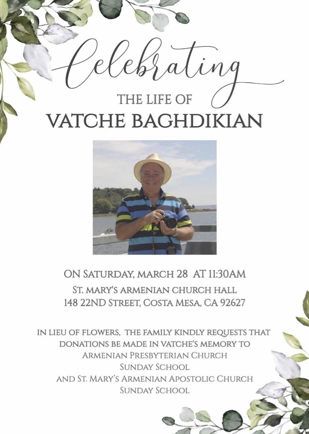 It is with a heavy heart that we announce the passing of Vatche Baghdikian. The family invites you to his Celebration of Life on Saturday, March 28 at 11:30 AM at St. Mary's Armenian Church Hall, 148 22nd Street, Costa Mesa, CA 92627.