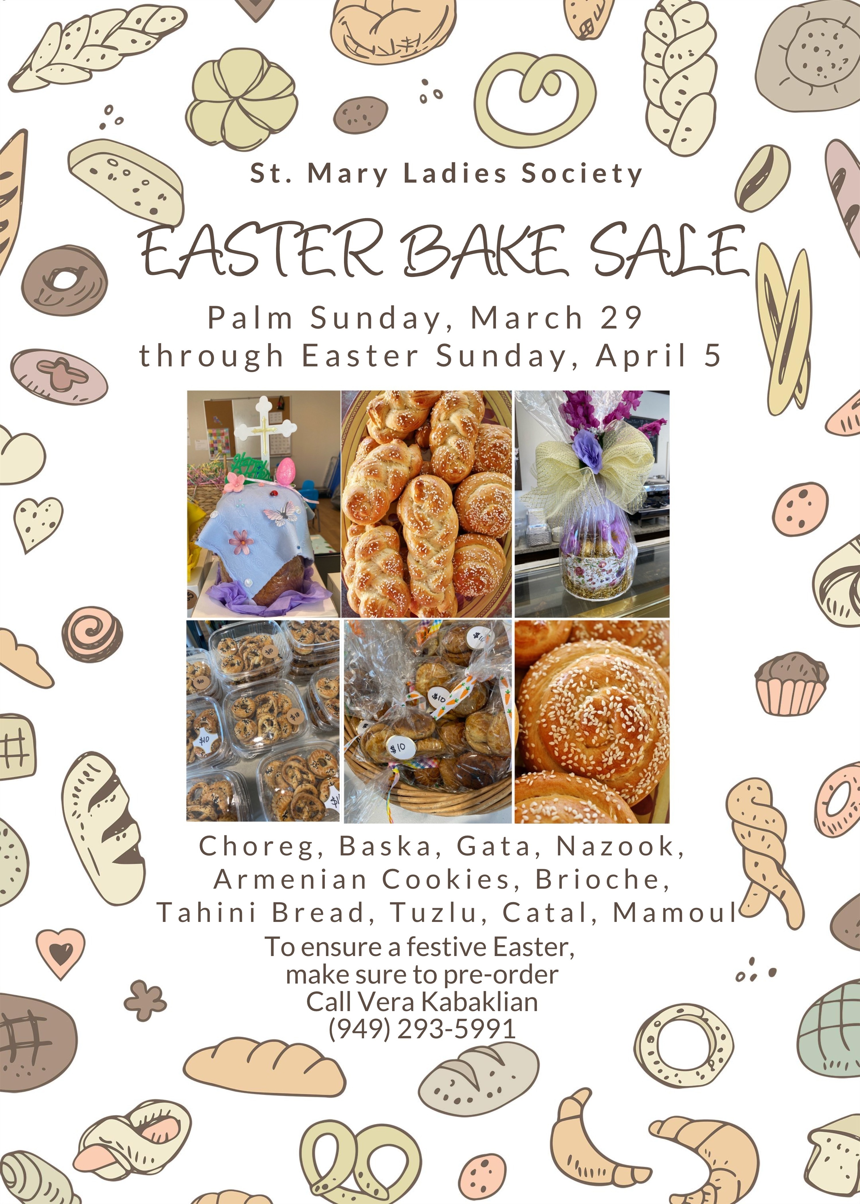 Featured homemade Armenian items: Choreg, Baska, Gata, Nazook, Armenian cookies, brioche, tahini bread, and Mamoul.