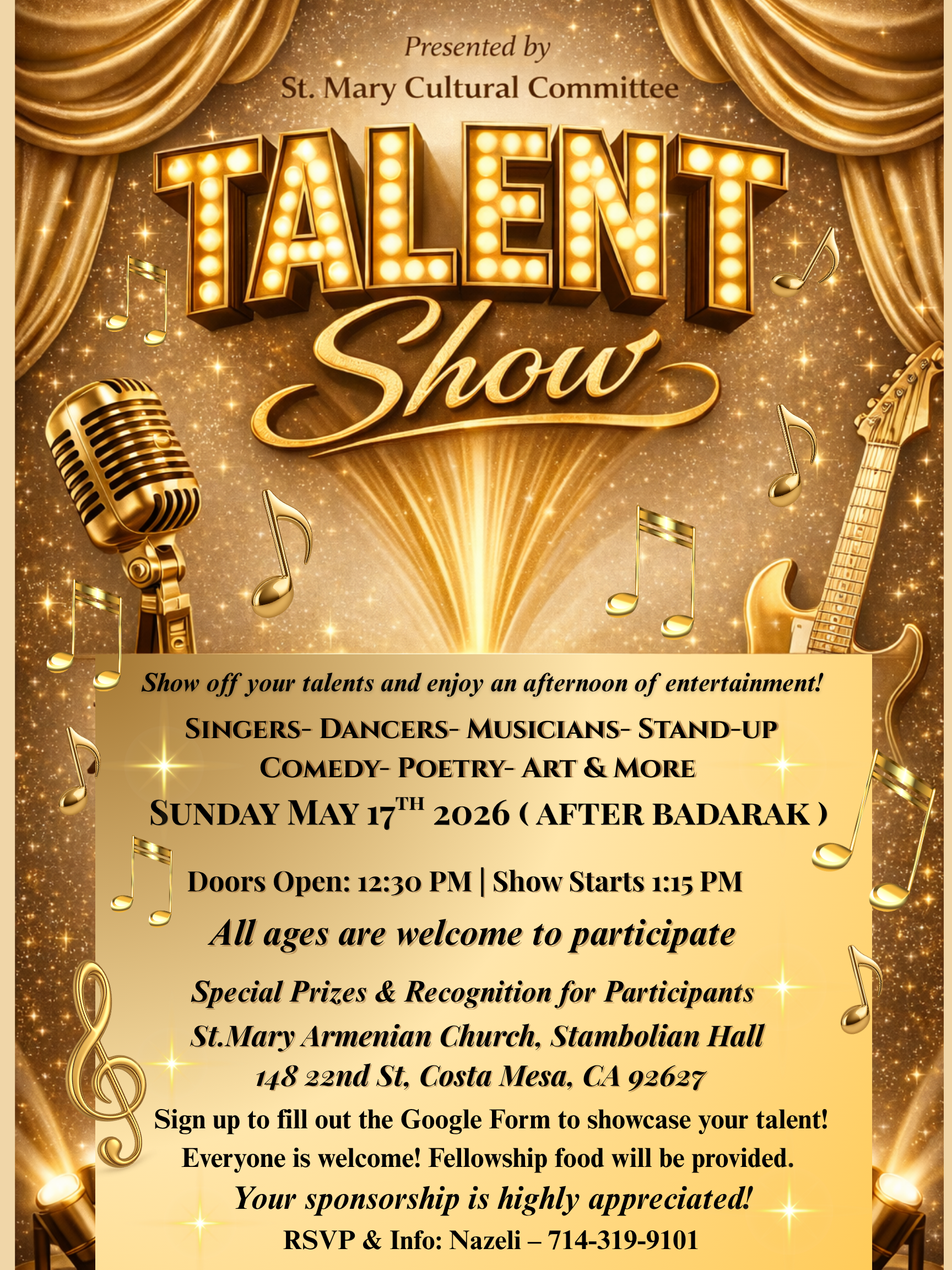 Join us for a joyful celebration filled with amazing performances, delicious food, warm fellowship, and plenty of fun. We’d love to see our St. Mary parishioners come together and share their incredible talents with one another in the beautiful Stambolian Hall.
